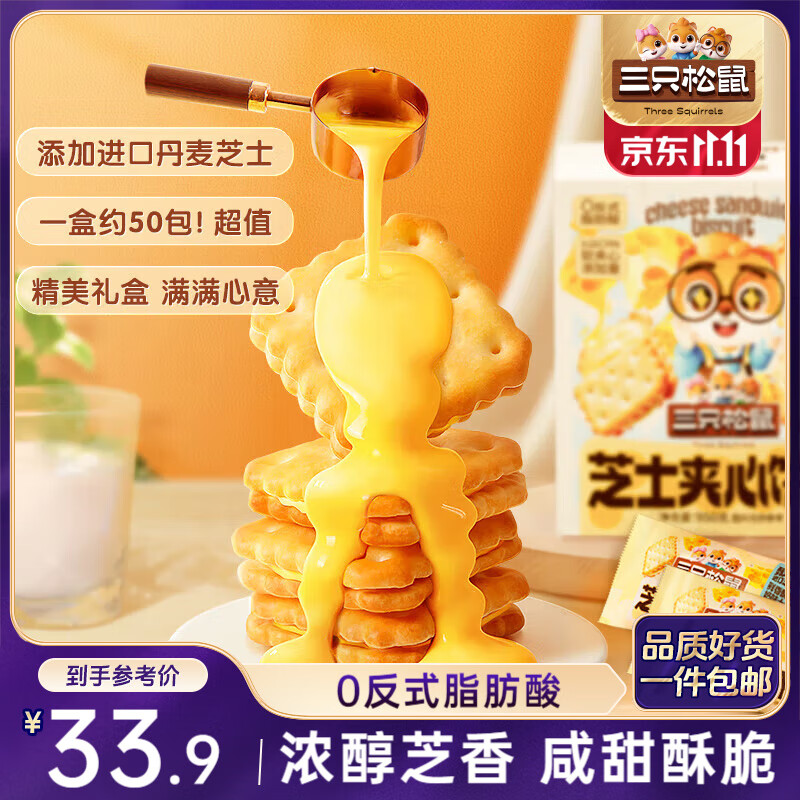 【京东商城】【食品保健】三只松鼠芝士夹心饼干950g休闲零食营养早餐糕点量贩健康礼