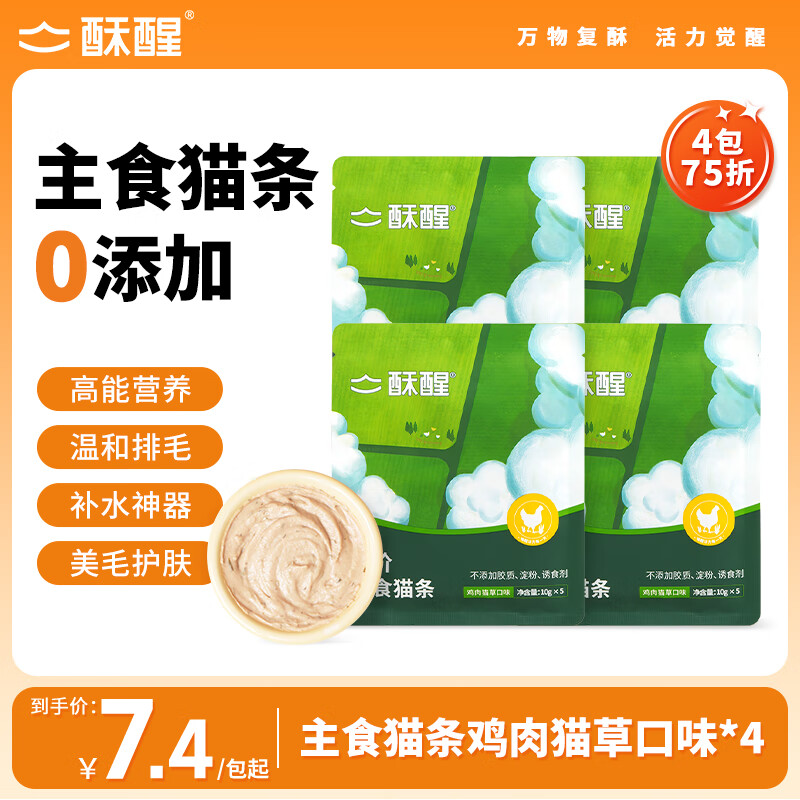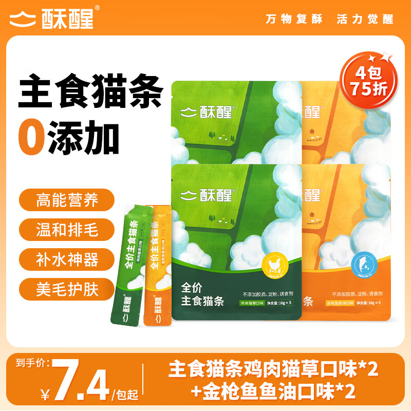 【京东商城】【食品保健】酥醒全价主食猫条无添加鸡肉猫草口味2包+金枪鱼鱼油口味2