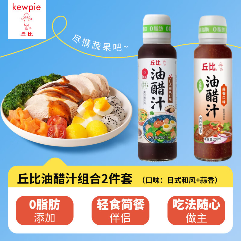 【京东商城】【食品保健】丘比0脂油醋汁(日式+蒜香) 调味品 蔬菜水果沙拉汁酱 260ml*2