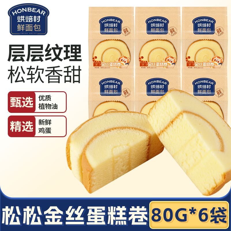 【京东商城】【食品保健】烘焙村松松金丝蛋糕卷80g*6袋