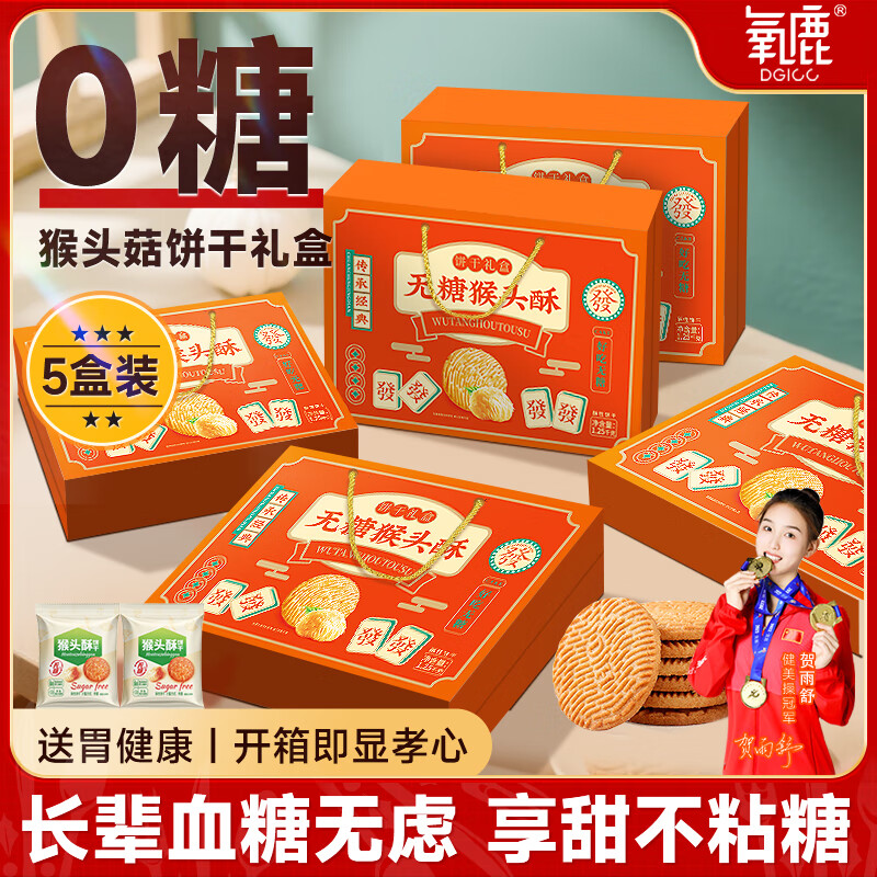 【京东商城】【食品保健】0糖猴头菇饼干1250g*5盒 无糖食品礼盒送长辈企业团购专用