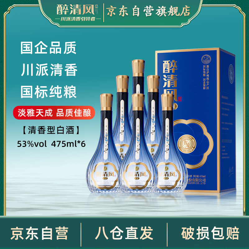 【京东商城】【食品保健】醉清风淡雅系列清香型纯粮酿造白酒53度475ml*6瓶礼盒装送礼
