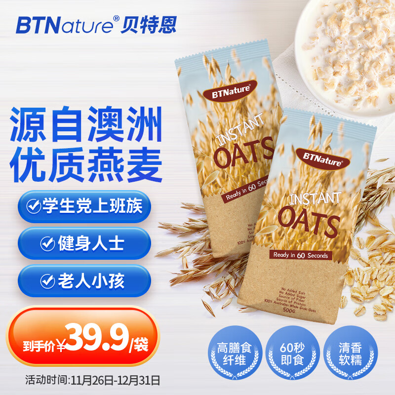 【京东商城】【食品保健】BTNature贝特恩燕麦片即食纯燕麦牛奶早餐搭档谷物代餐儿童女