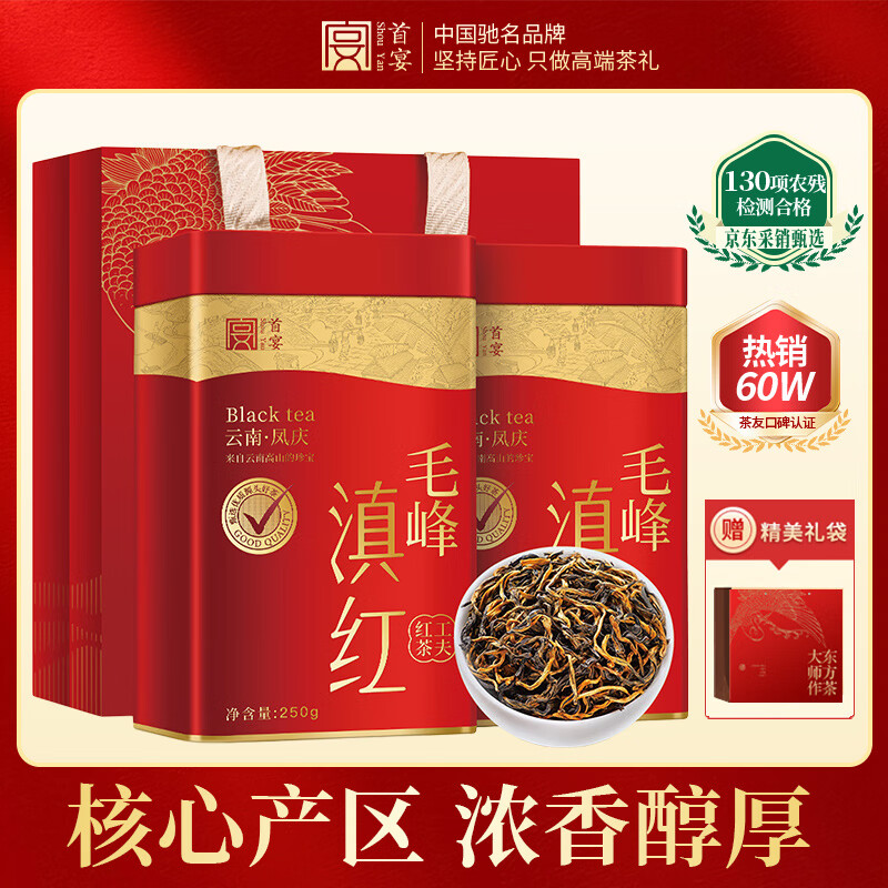 【京东商城】【食品保健】首宴云南滇红浓香耐泡红茶滇红毛峰滇红工夫红茶茶叶礼盒