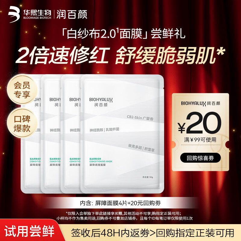 【京东商城】【美容美妆】润百颜屏障调理白纱布2.0面膜4片补水舒缓干痒红敏肌晒后修