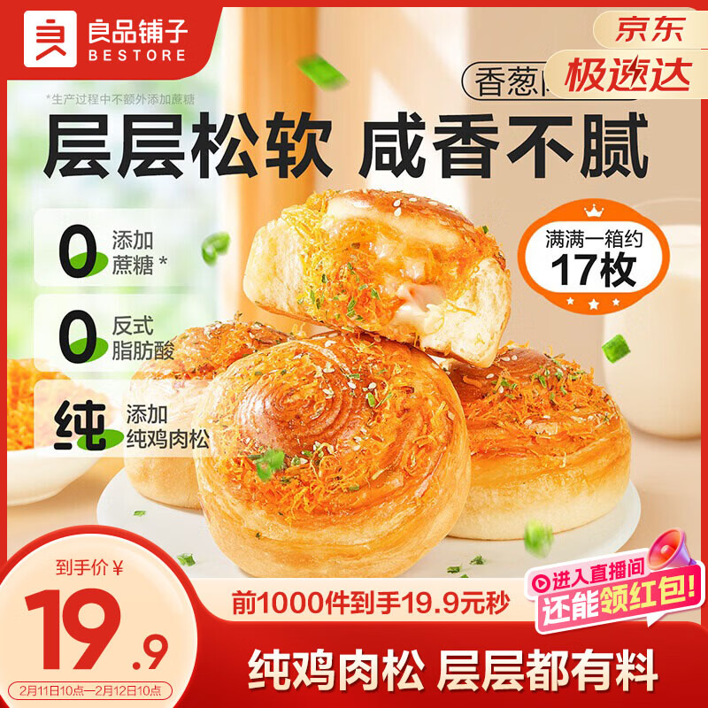 【京东商城】【食品保健】良品铺子香葱肉松手撕面包800g早餐面包代餐点心休闲学生零