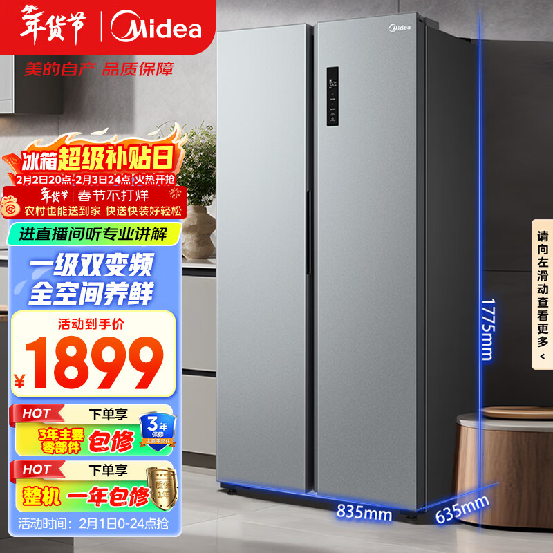 【京东商城】【生活家电】美的(Midea)527L十字门冰箱零嵌三档变温一级能效风冷无霜