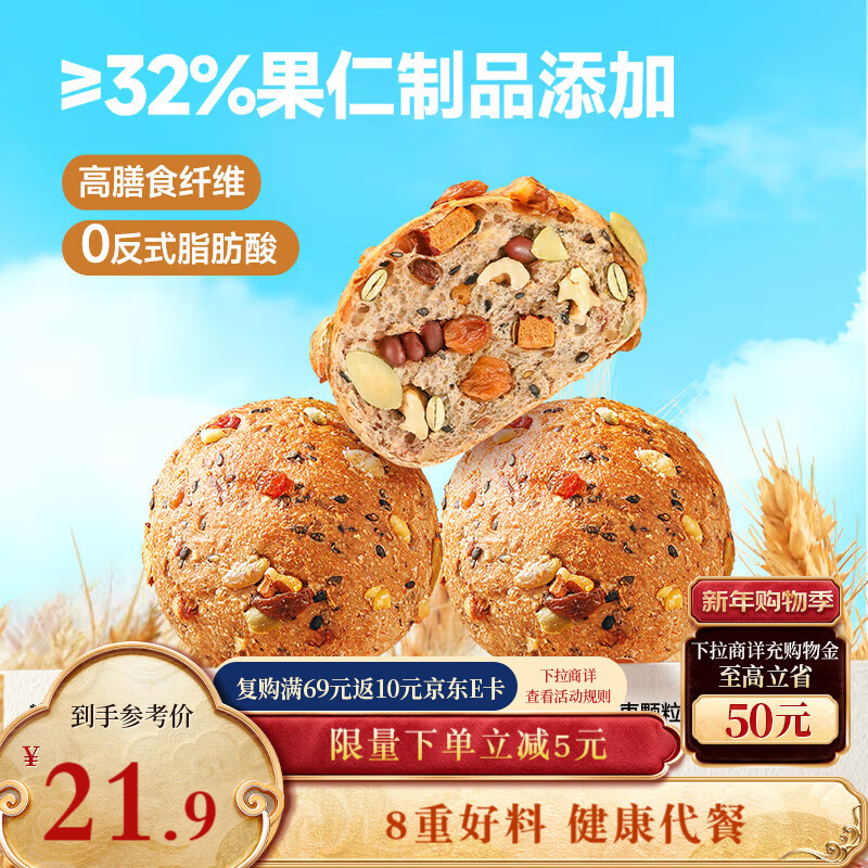 【京东商城】【食品保健】三只松鼠坚果车轮面包500g 核桃果仁健康零食粗粮吐司代餐饱