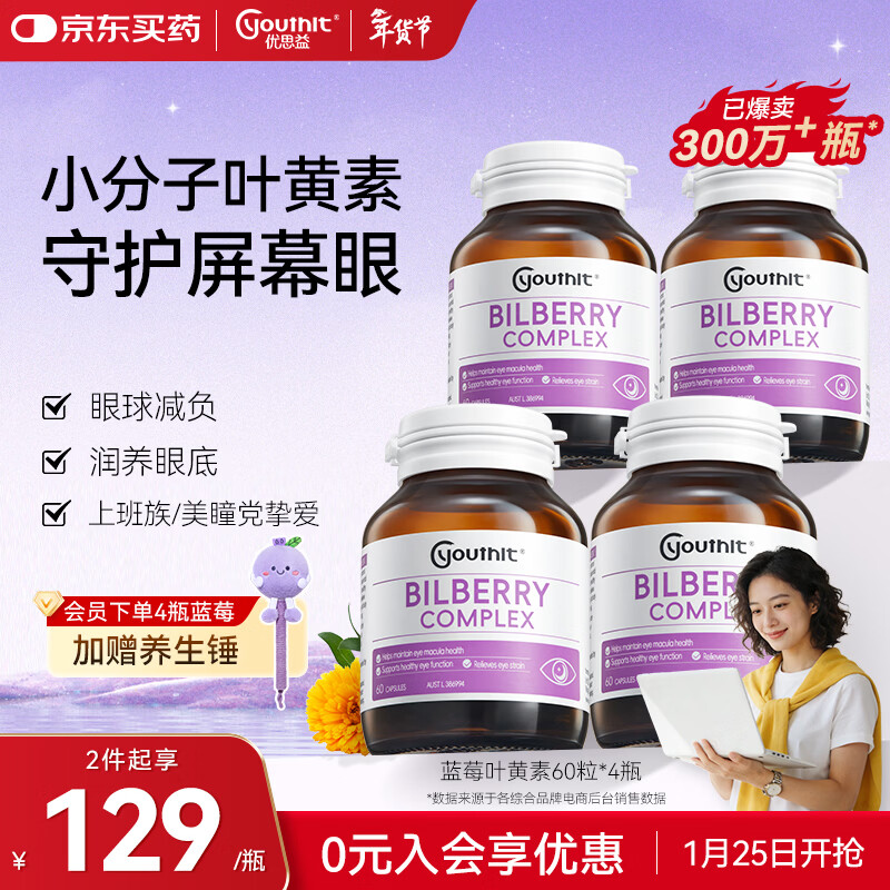 【京东商城】【食品保健】优思益youthit蓝莓叶黄素护眼胶囊越橘提取物 成人缓解视疲劳