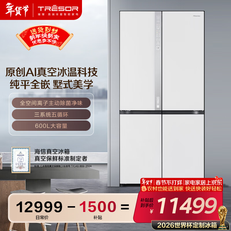 【京东商城】【生活家电】海信璀璨600真空头等舱零嵌入式十字对开四门一级能效家电