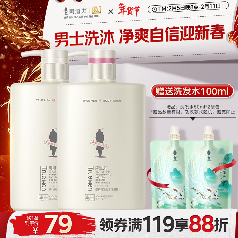 【京东商城】【美容美妆】阿道夫男士祛屑止痒洗沐套装 洗发水沐浴露450ml*2 茶树洗发
