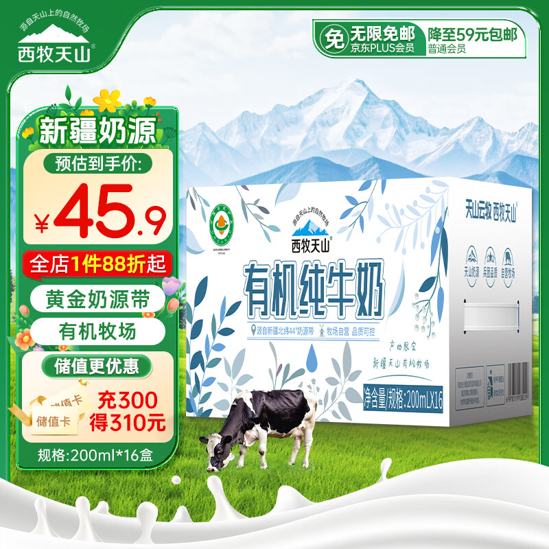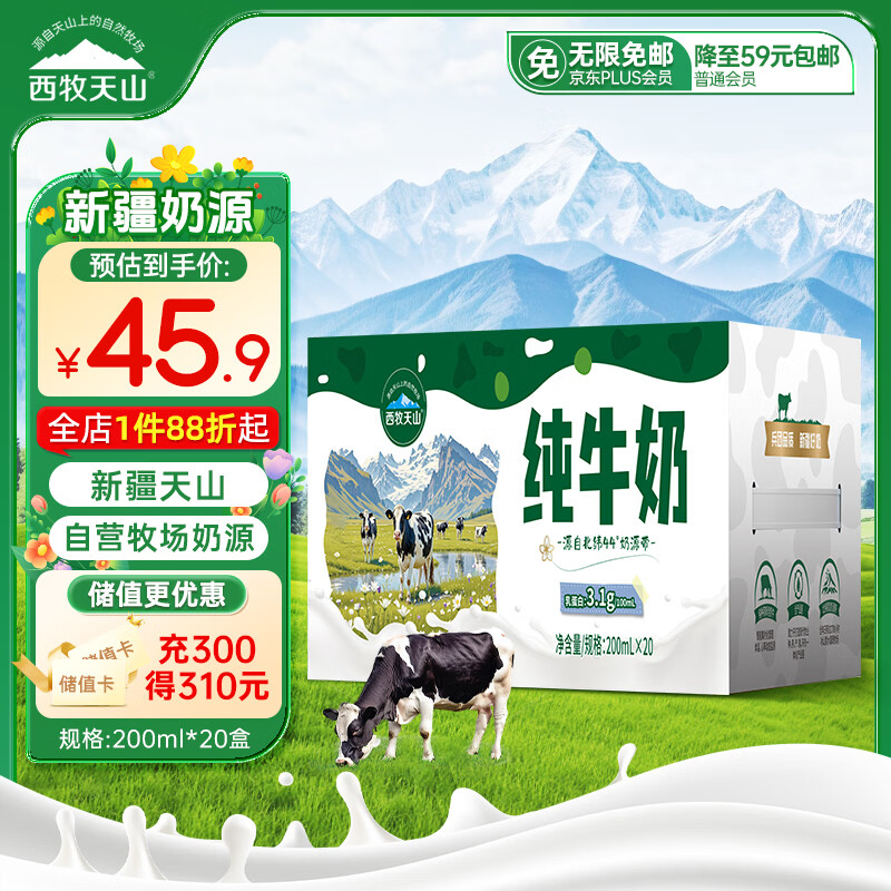【京东商城】【食品保健】西牧天山新疆纯牛奶200ml*20盒整箱装全脂牛奶儿童学生营养早
