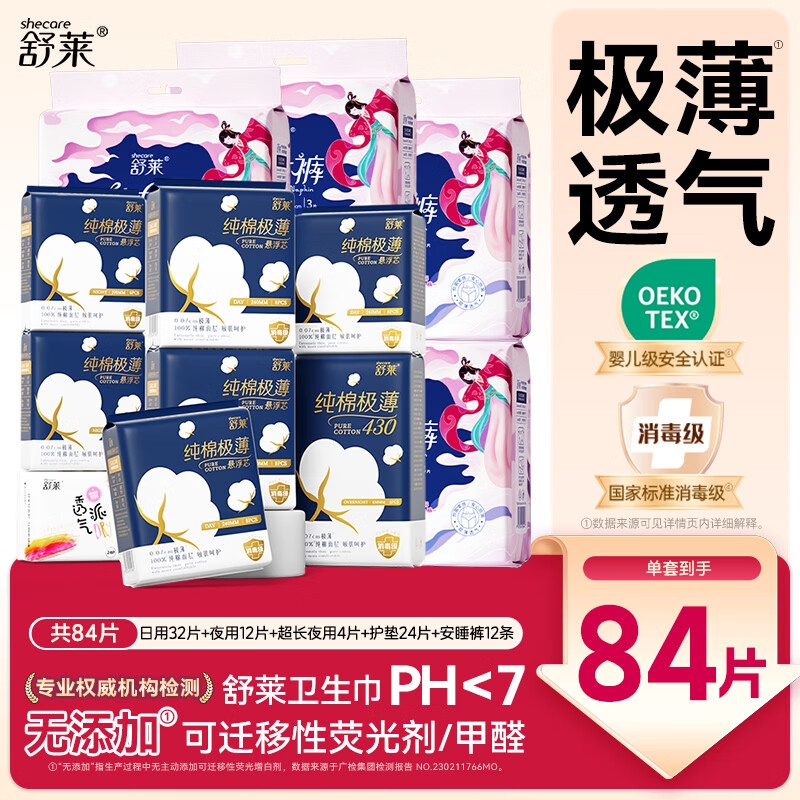 【京东商城】【美容美妆】舒莱消毒级纯棉极薄卫生巾安睡裤日夜组合装共84片