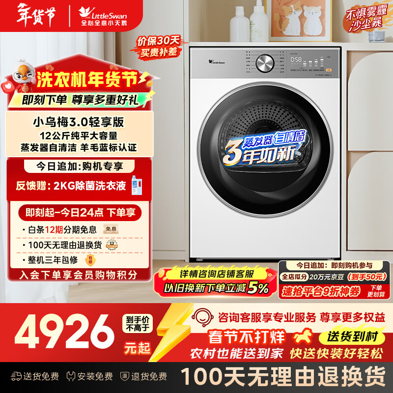 【京东商城】【生活家电】小天鹅(LittleSwan)小乌梅3.0轻享版 12KG大容量 热泵烘干机 变