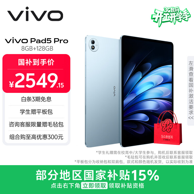 【京东商城】【电脑办公】vivo Pad5 Pro 8GB+128GB 春潮蓝 国家补贴15% 蓝晶×天玑9400 13英寸原