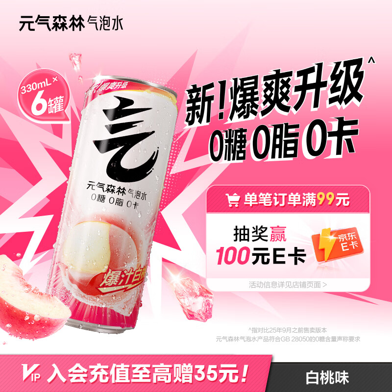 【京东商城】【食品保健】元气森林0糖0脂0卡 白桃味 无糖气泡水330mL*6罐装饮料