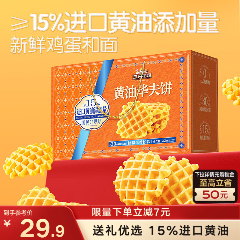 【京东商城】【食品保健】三只松鼠黄油华夫饼750g礼盒装 蛋糕早餐代餐糕点点心团购年
