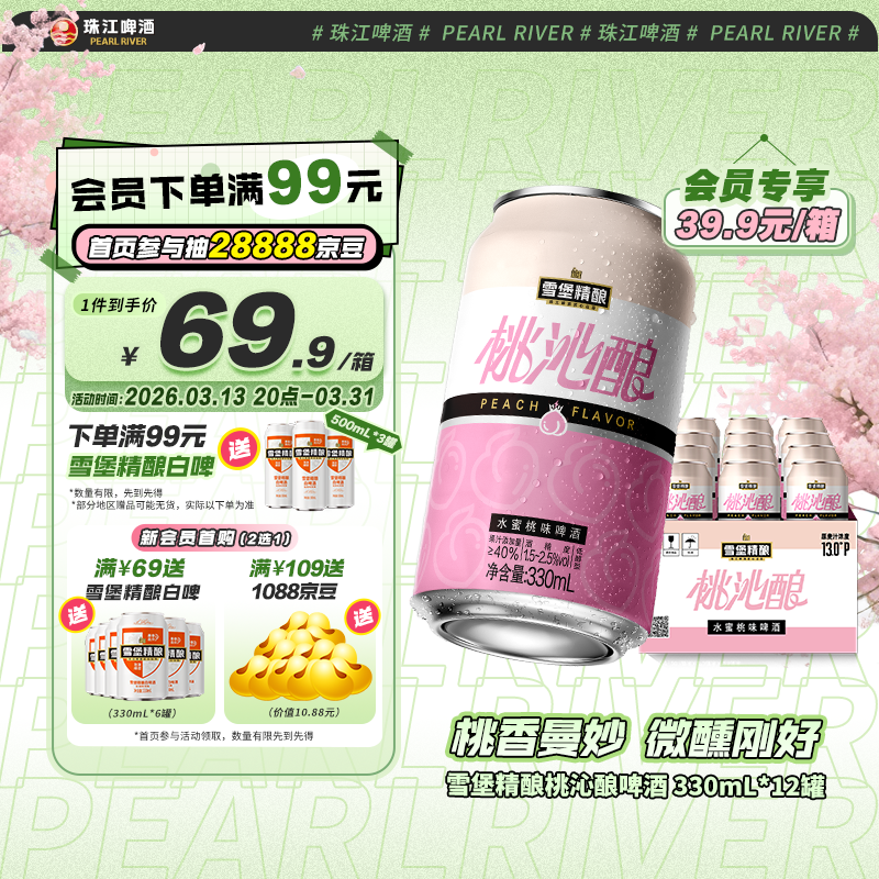 【京东商城】【食品保健】珠江啤酒13度 雪堡精酿桃沁酿啤酒 330mL*12罐