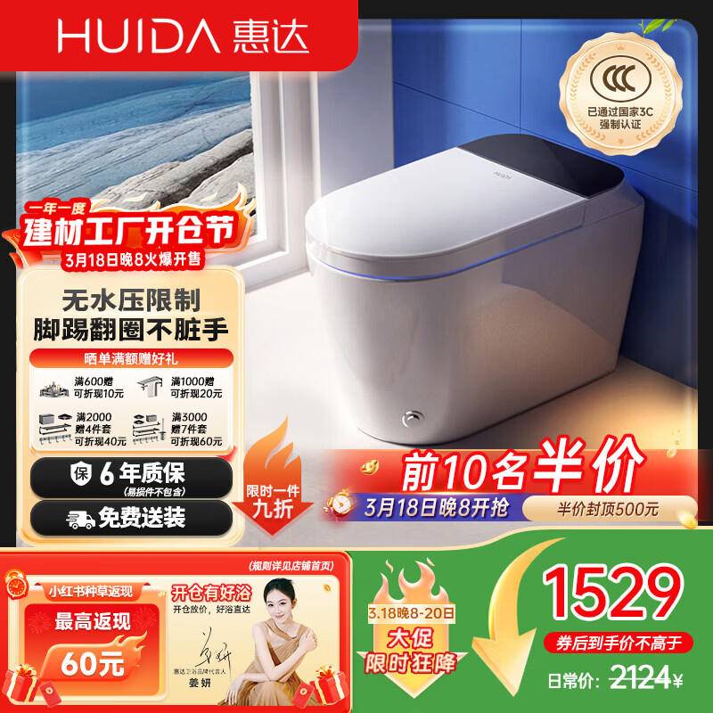 【京东商城】【家居家装】惠达(HUIDA)智能马桶带水箱翻圈翻盖离座停电冲水泡沫盾CK0