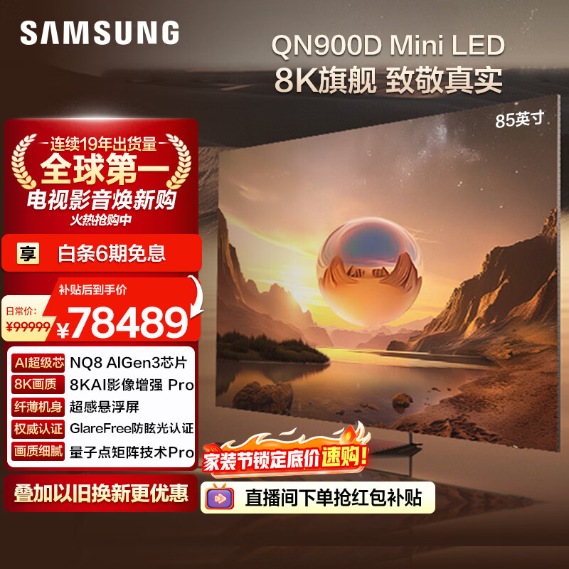 【京东商城】【生活家电】三星顶奢款 85英寸 4K240Hz 8K120Hz QLED电视 全面屏 AI电视 QA85QN9