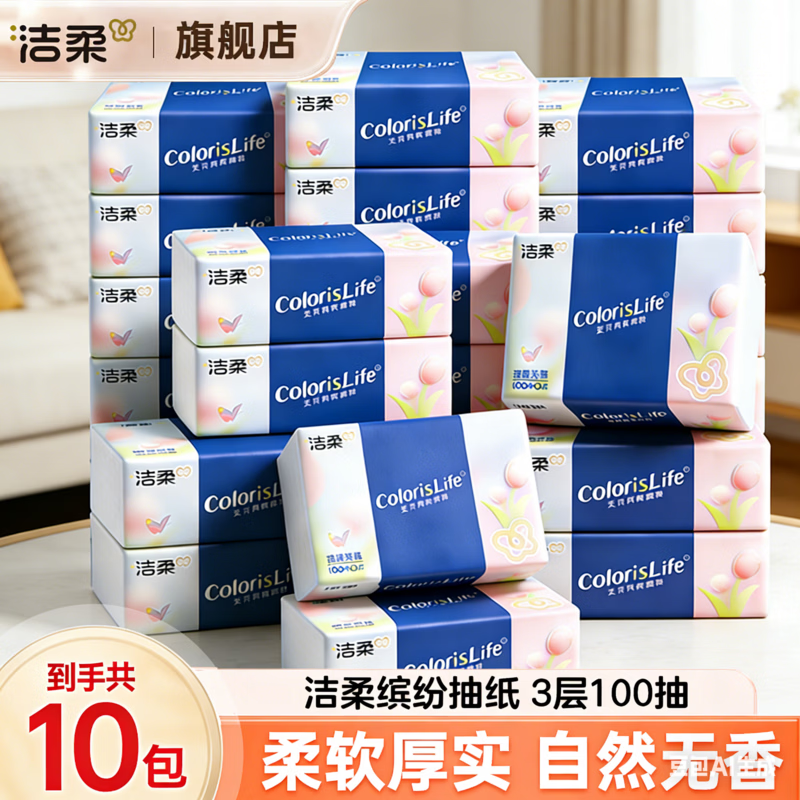 洁柔抽纸3层纸巾缤纷纸抽300张面纸餐巾纸可湿水面巾纸擦手纸婴儿纸 【整箱拆包发】100%原生木浆 3层 300张*10包