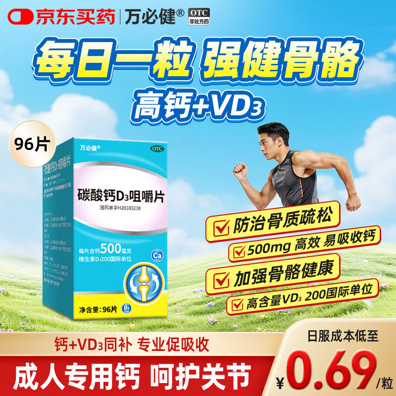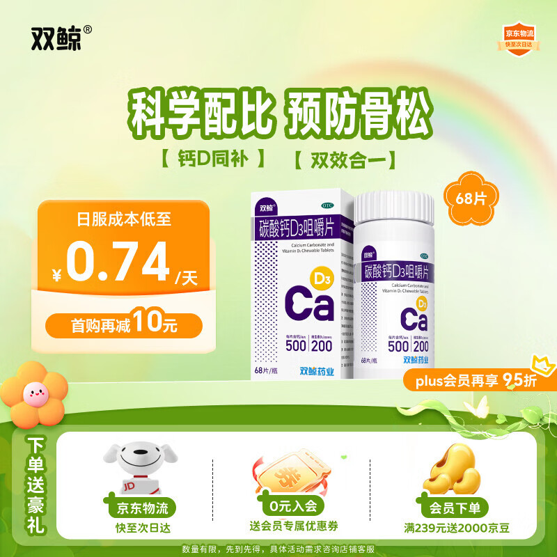 【京东商城】【食品保健】双鲸 碳酸钙D3咀嚼片 68片 预防骨质疏松 成人钙碳酸钙儿童