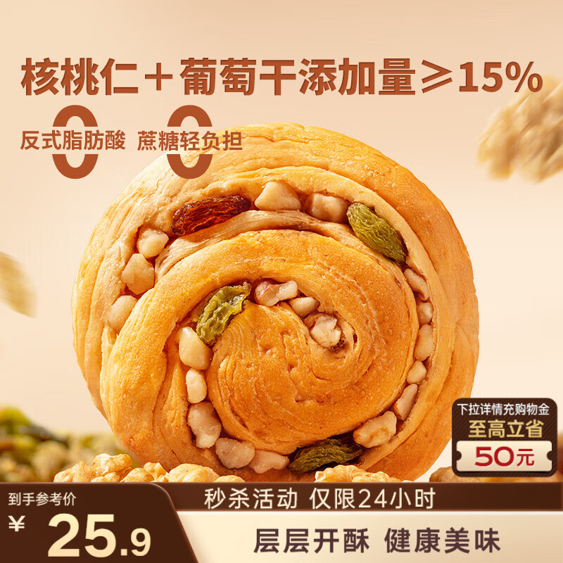 【京东商城】【食品保健】三只松鼠无蔗糖坚果仁手撕面包1.1kg 早餐小面包吐司蛋糕代