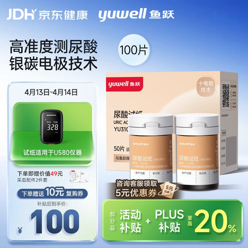 【京东商城】【食品保健】鱼跃U580尿酸测试仪家用自动免调码【无仪器+100尿酸试纸+100