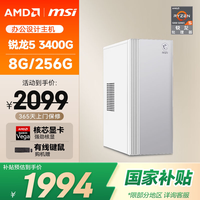 【京东商城】【电脑办公】AMD&微星Creator( 锐龙R5 3400G 8G 256G 商务键鼠)设计师商用办公
