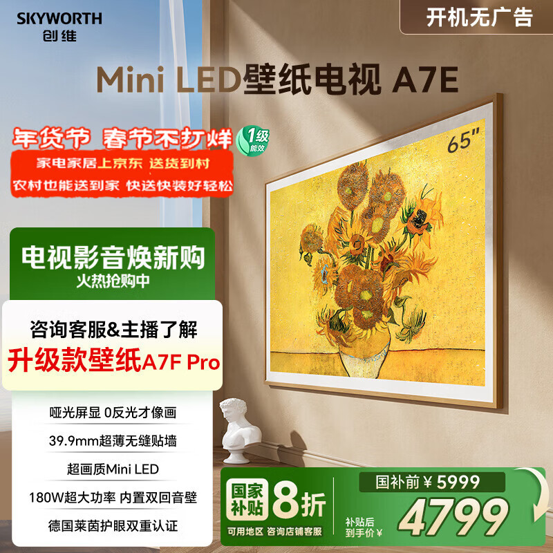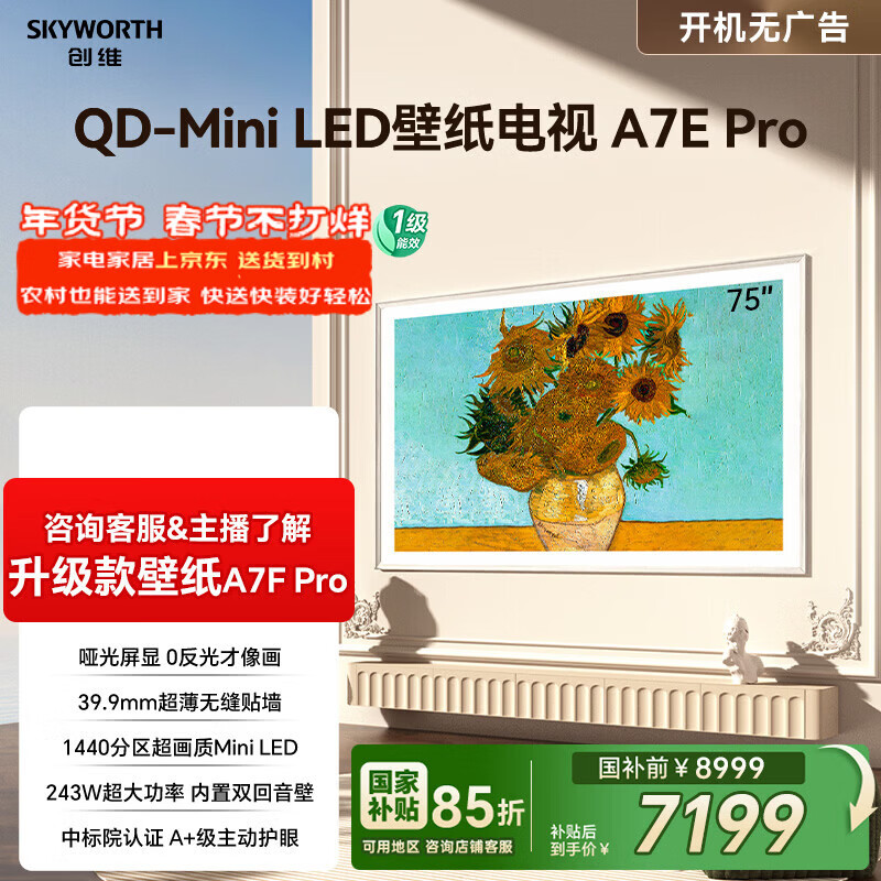 【京东商城】【生活家电】创维壁纸电视75A7E Pro 75英寸智能平板液晶游戏电视机 超薄75