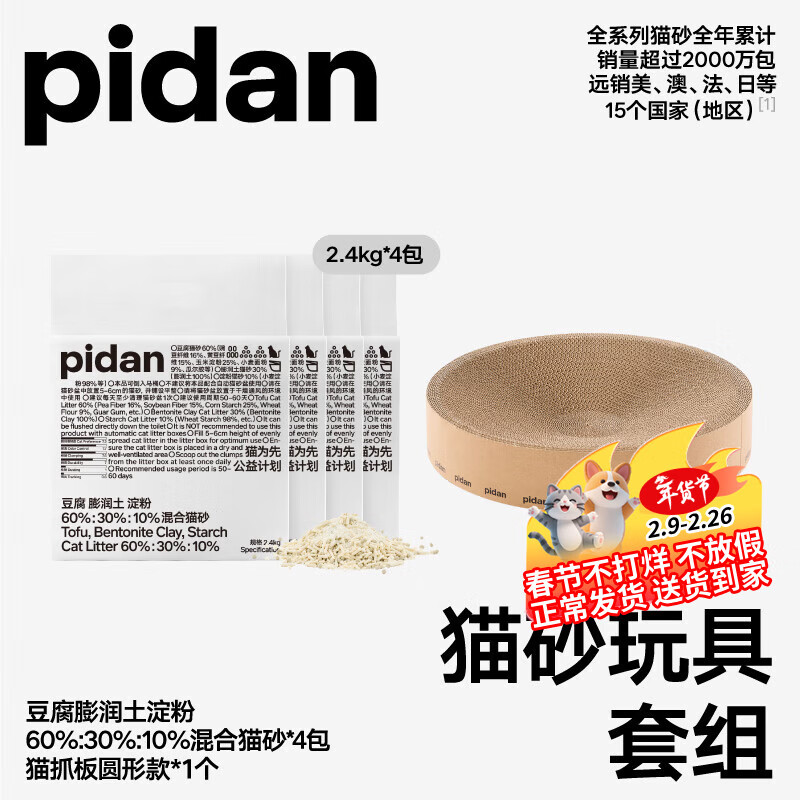 【京东商城】【食品保健】pidan猫砂抓板套组 经典豆腐混合猫砂2.4kg*4包+圆形抓板