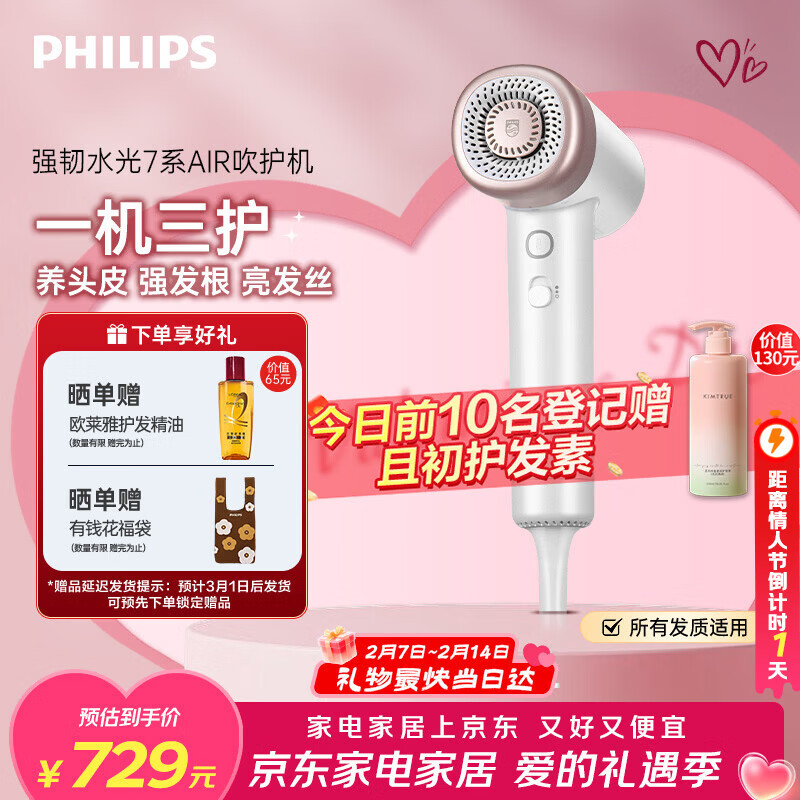【京东商城】【美容美妆】飞利浦(PHILIPS)7系AIR高速护发吹风机 吹护机 珍珠白 负离子