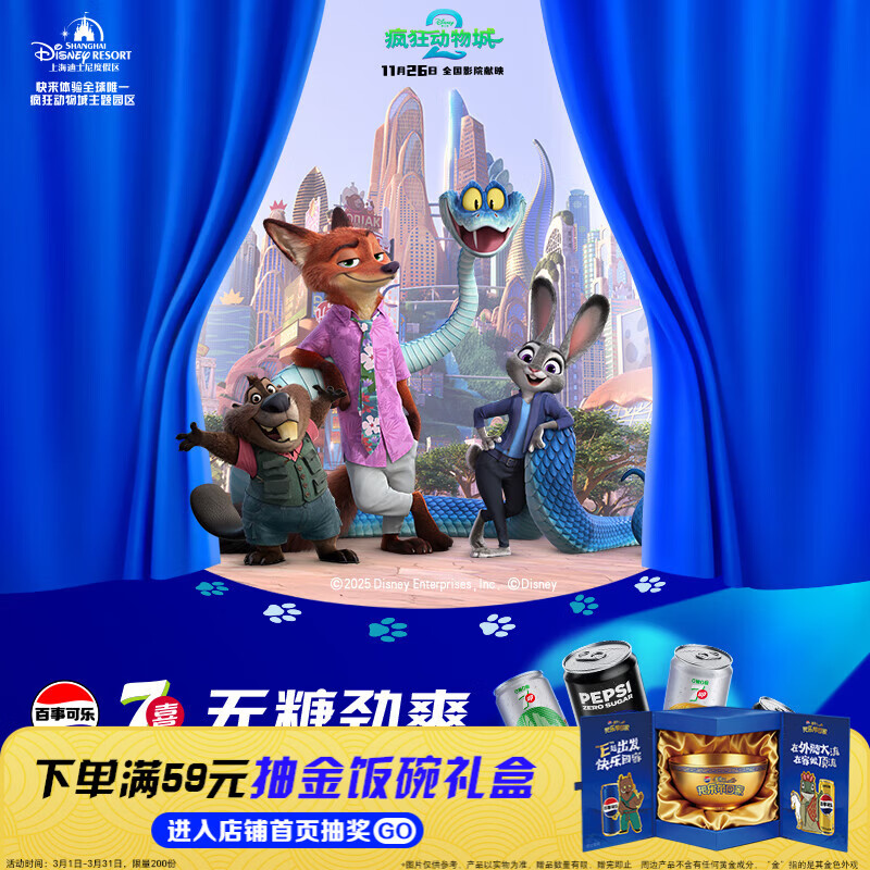 【京东商城】【食品保健】百事可乐无糖X疯狂动物城联名330ml*20x4+(贴纸+透卡+冰箱贴+