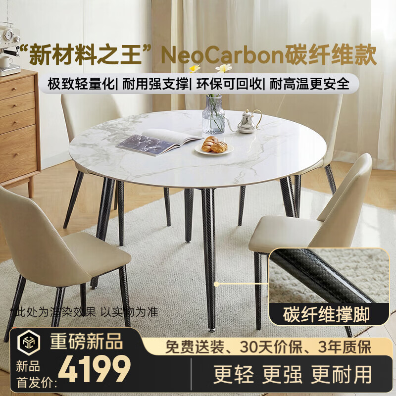 【京东商城】【家居家装】京东京造月星T400碳纤维桌子现代简约时尚家用汉白玉岩板圆1