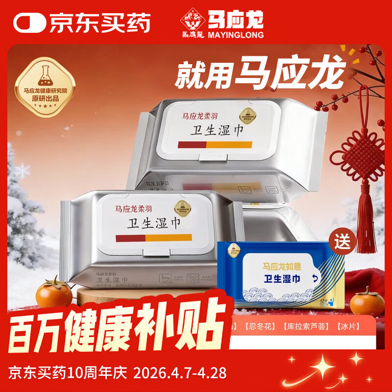 【京东商城】【食品保健】马应龙卫生湿巾80抽*3包家庭装擦屁屁厕纸痔疮专用卫生湿巾