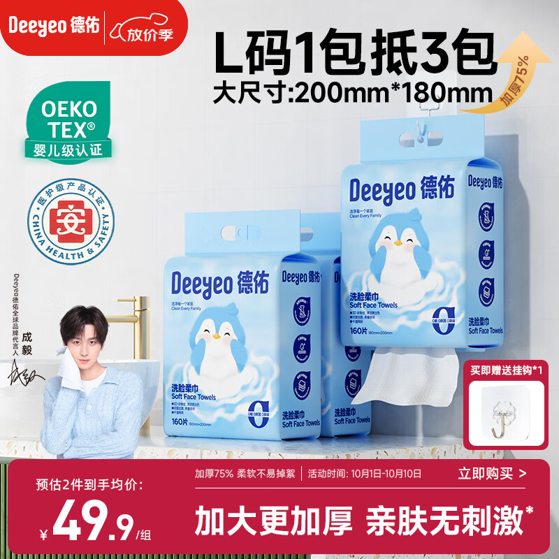 德佑悬挂式洗脸巾160抽*3提 加大加厚一次性干湿两用擦脸巾绵柔洁面巾