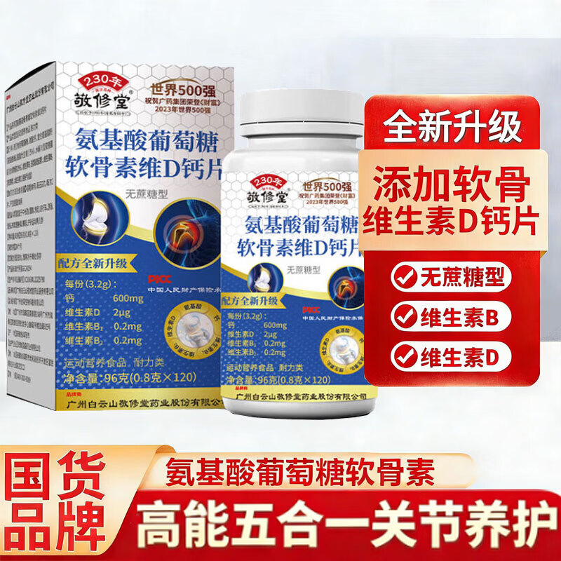 白云山氨基酸葡萄糖软骨素+VD钙片成人软骨钙片可搭中老年钙片无蔗糖 【1瓶共120粒】(无蔗糖型)三高适用 120粒*1瓶
