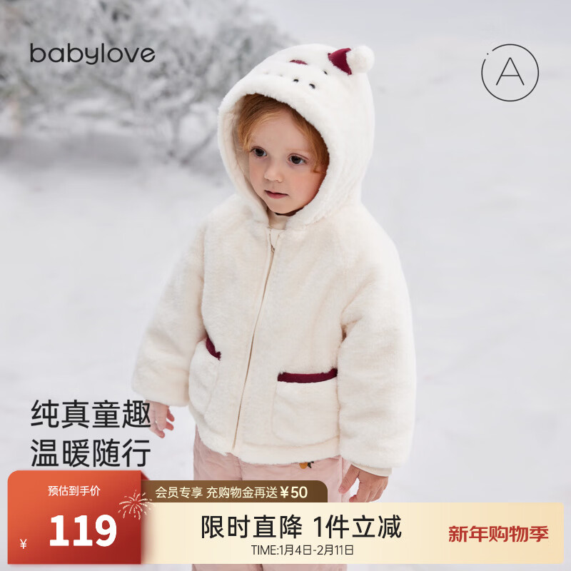 babylove【清仓】宝宝毛绒连帽外套冬季加厚加绒圣诞上衣婴幼儿夹棉保暖 流苏白 100