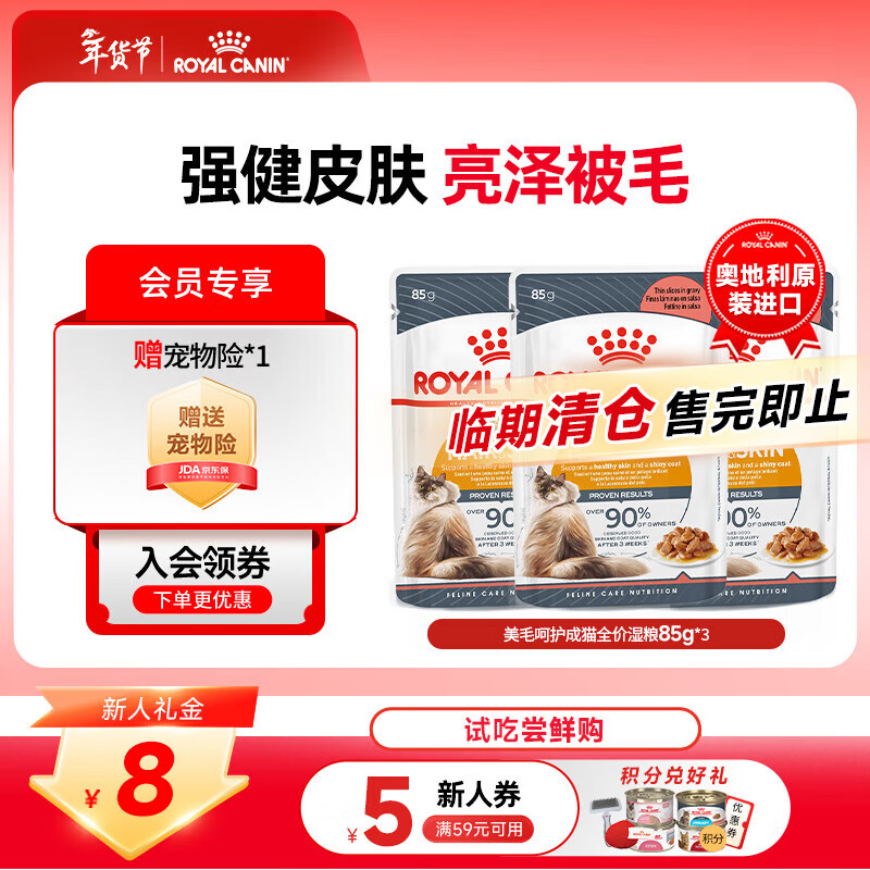 皇家成猫猫粮 美毛呵护成猫全价湿粮 猫咪零食进口猫粮 主食级 255g (85g*3袋 成猫湿粮包)[临期效期26年5月18日]