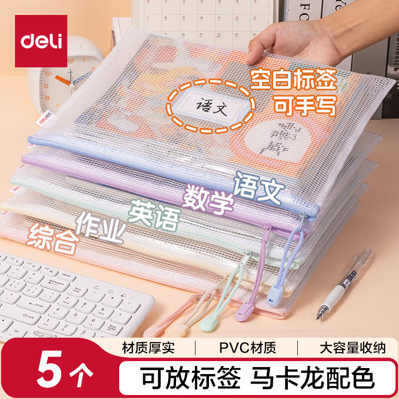 得力(deli)5只A4防水网格学科分类袋文件袋学生科目分类袋标签款 马卡龙色系混色63482