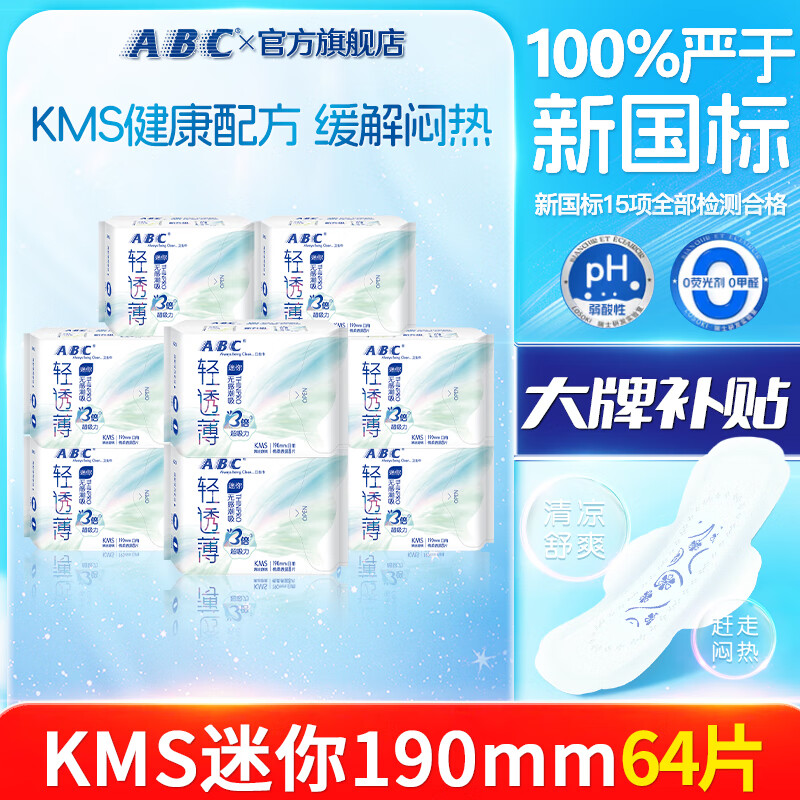ABCKMS日用夜用纤薄女生轻透气防漏贴身旗舰棉柔表层卫生巾正品店 KMS轻透薄迷你190mm 64片【带护翼】