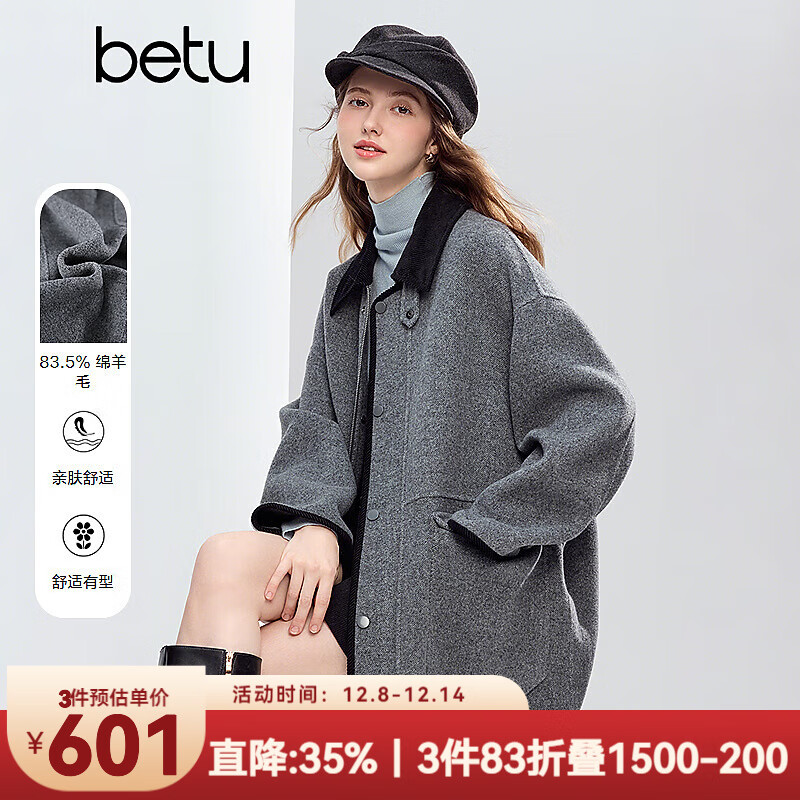 百图(betu)女装2025年冬季新款毛呢外套巴恩风撞色翻领双面呢大衣女2510T12 灰色 M