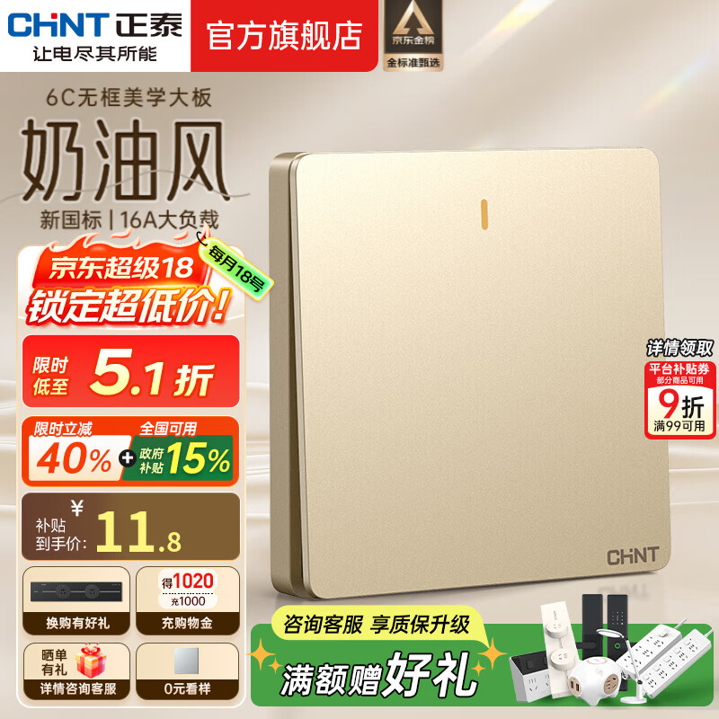 正泰(CHNT)开关插座6C 家用86型暗装斜五孔插座带USB插座面板无框大板香槟金 一开双控