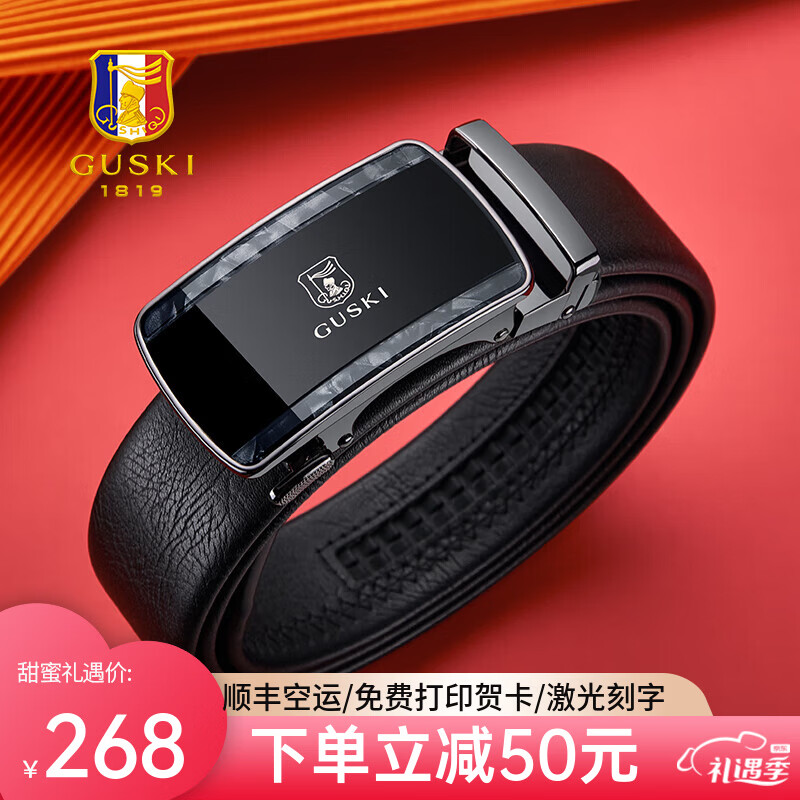 古士旗(GUSKI)法国品牌皮带男真皮自动扣男士裤腰带高档生日情人节礼物送男友 680016A枪扣时尚款+头层牛皮【专柜礼盒】 115cm -130cm随机联系客服指定