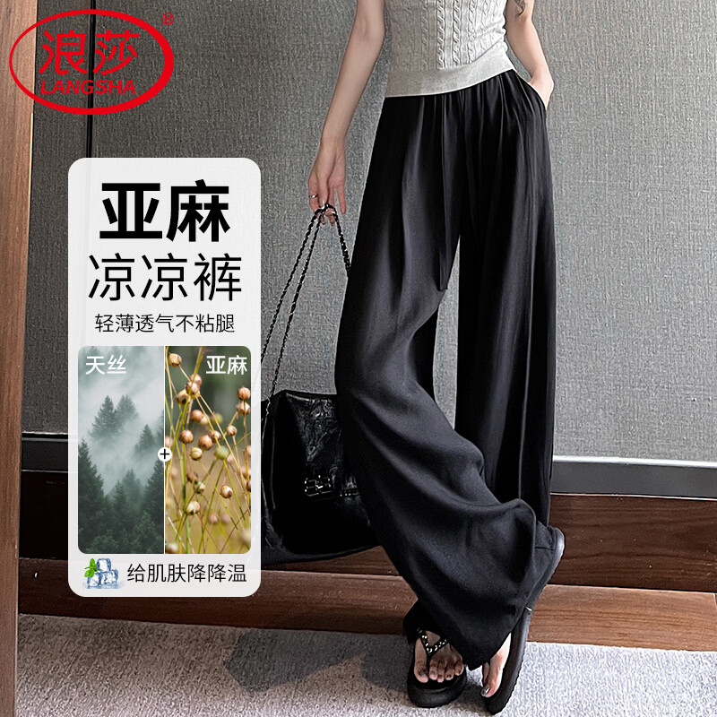 浪莎藏青色天丝亚麻裤女夏季薄款2026新款小个子冰丝棉麻弯刀阔腿裤子 黑色 【天丝+天然亚麻】 XL 【适合131-150斤】