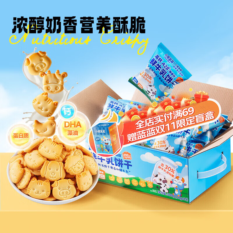 小鹿蓝蓝儿童零食牛奶饼干宝宝小饼干营养早餐休闲食品 鲜牛乳饼干1箱300g