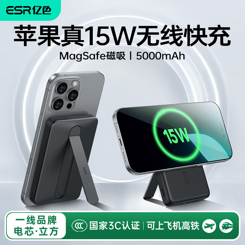亿色【苹果15W快充丨3C认证】磁吸充电宝MagSafe15W无线快充10000/5000毫安可上飞机移动电源适用苹果 魔力黑支架款丨5千毫安【3C认证】 支持苹果15W无线快充