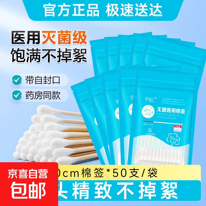 平旺医用棉签自封口灭菌级单头一次性消毒棉棒药用家用清洁卫生 10厘米*50支*2袋自封口