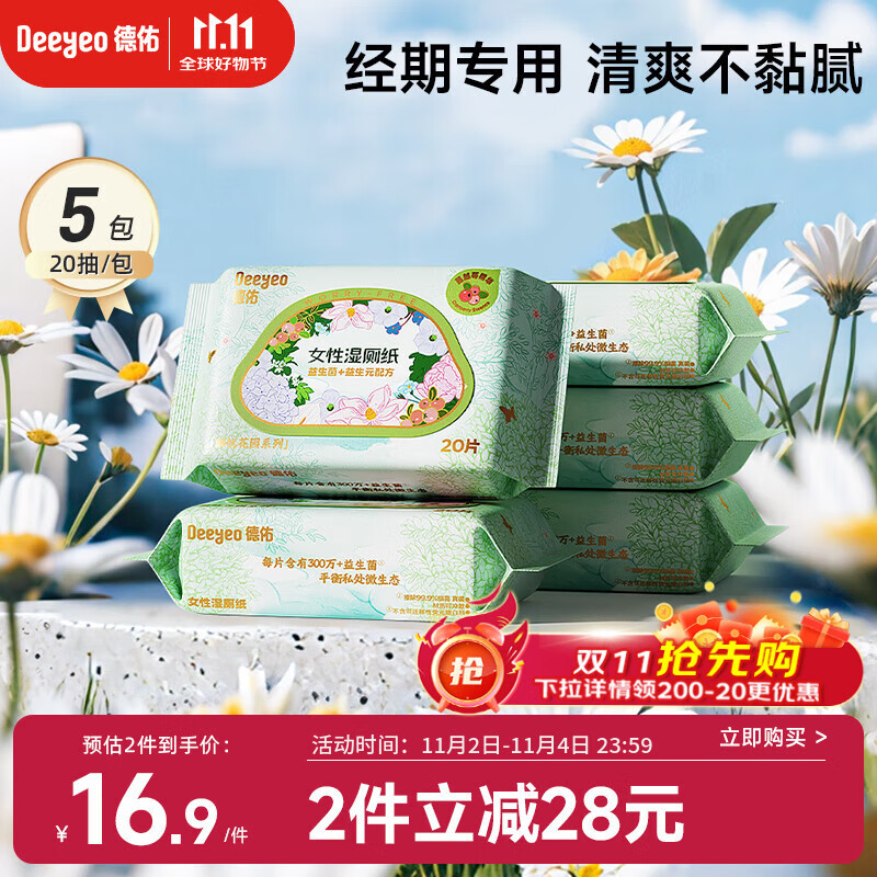 德佑女性湿厕纸益生菌湿纸巾 经期可用私处护理洁厕 母婴可用20抽*5包