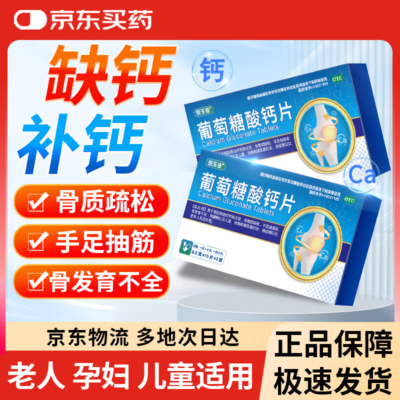 恒玉佳葡萄糖酸钙片 0.5g*15片*2板 预防治疗钙缺乏症骨质疏松手足抽搐骨发育不全佝偻病儿童老年人妊娠补钙